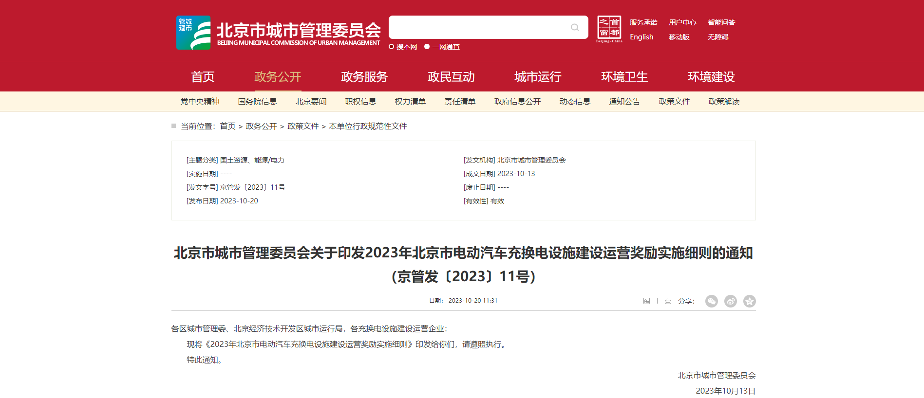 北京市城市管理委員會關(guān)于印發(fā)《2023年北京市電動汽車充換電設(shè)施建設(shè)運營獎勵實施細(xì)則》的通知。