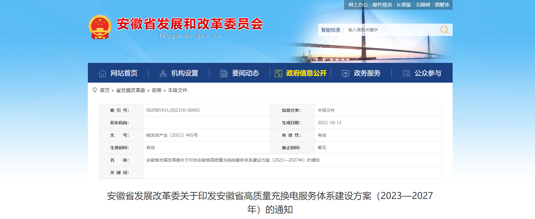 安徽省發(fā)展改革委關(guān)于印發(fā)《安徽省高質(zhì)量充換電服務(wù)體系建設(shè)方案(2023—2027年)》的通知。
