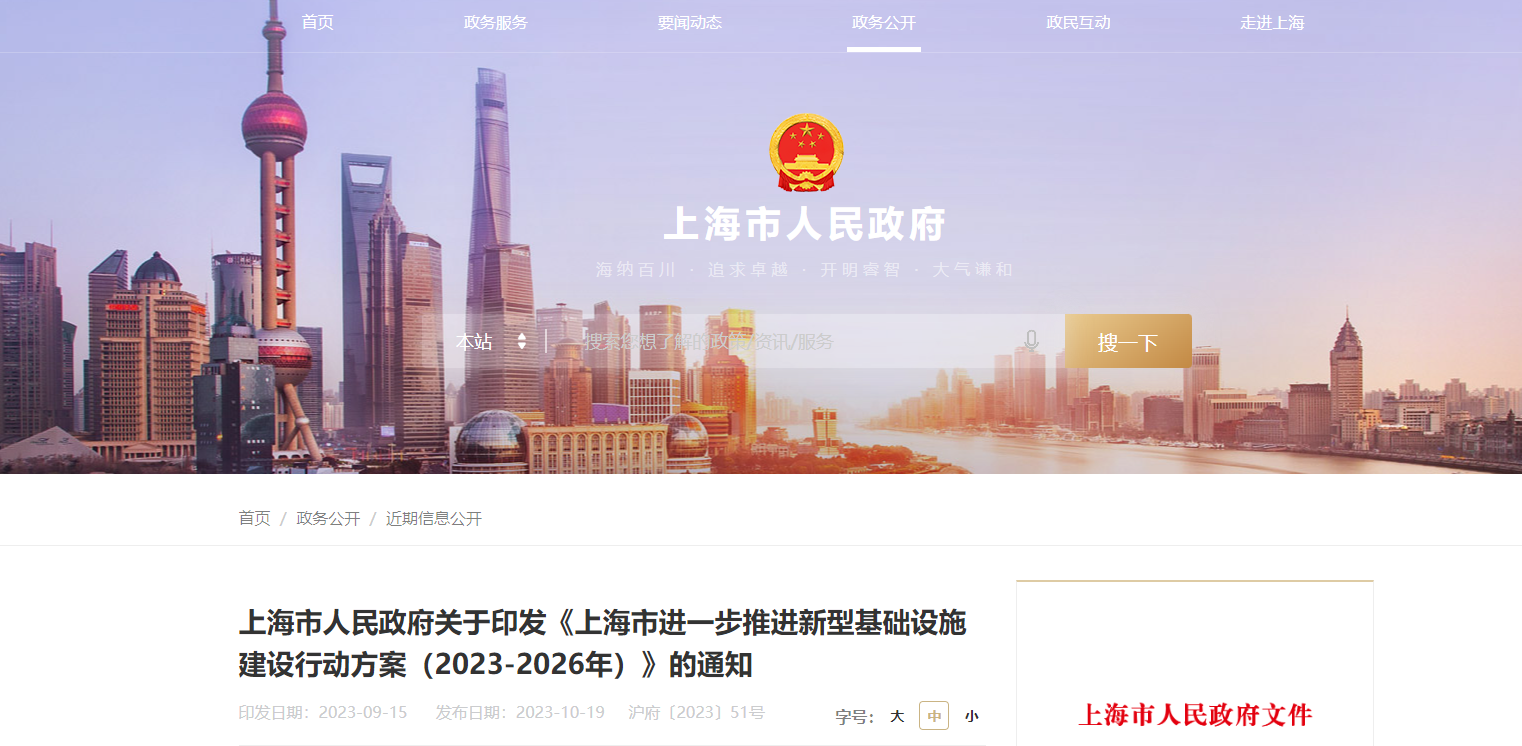 上海市人民政府關(guān)于印發(fā)《上海市進(jìn)一步推進(jìn)新型基礎(chǔ)設(shè)施建設(shè)行動方案(2023-2026年)》的通知。