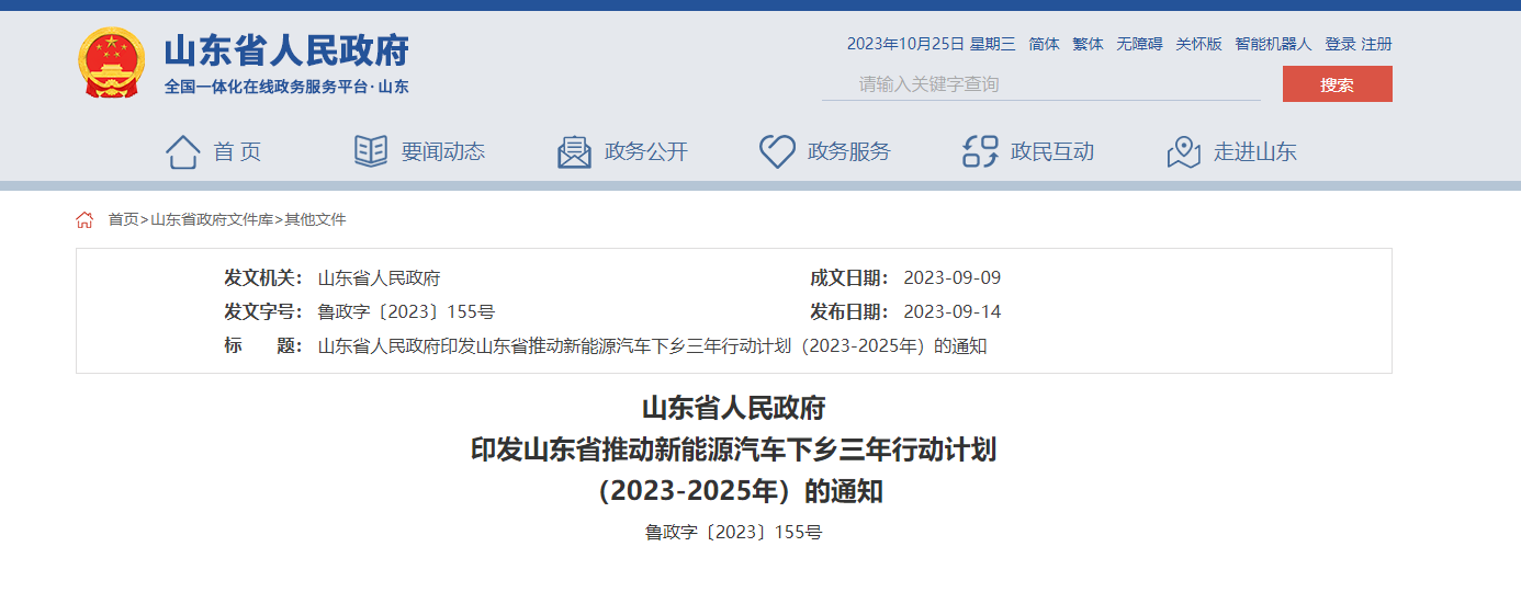 山東省人民政府印發(fā)《山東省推動新能源汽車下鄉(xiāng)三年行動計劃(2023-2025年)》的通知。