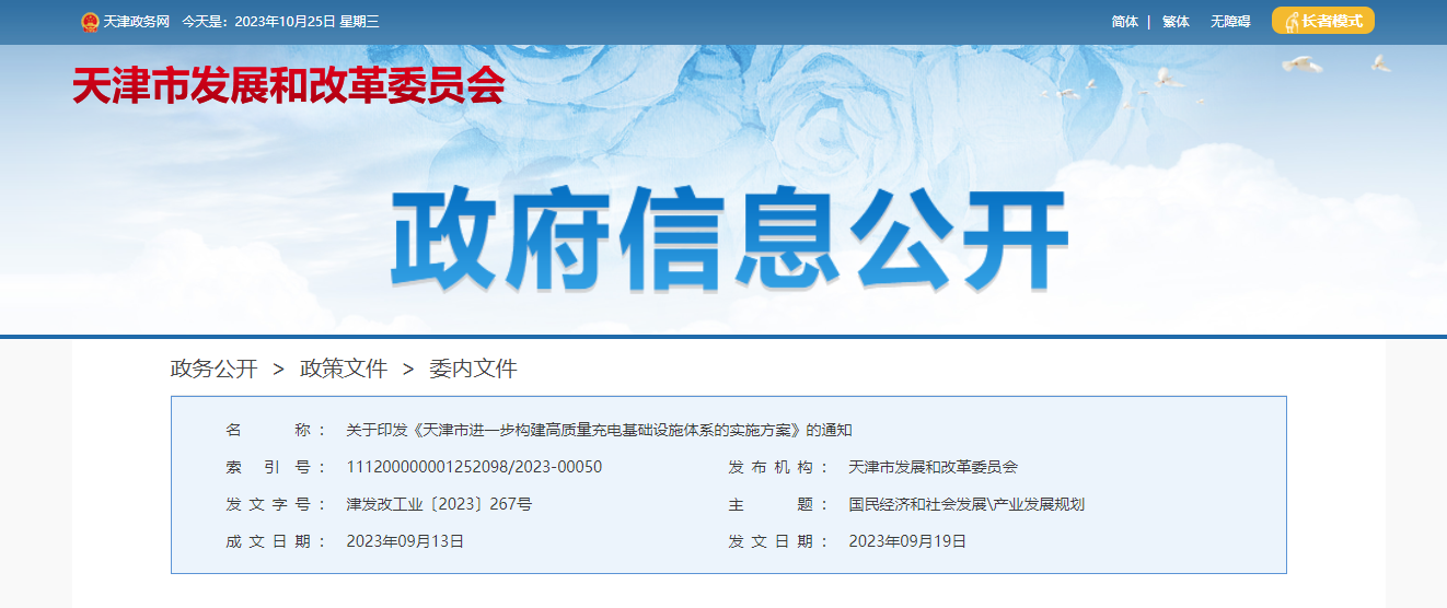 天津市發(fā)展改革委關(guān)于印發(fā)《天津市進(jìn)一步構(gòu)建高質(zhì)量充電基礎(chǔ)設(shè)施體系的實施方案》的通知。